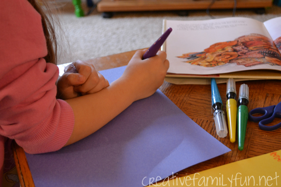 We used construction paper and our markers to create the designs on the rug. I joined along this time instead of just observing the process.