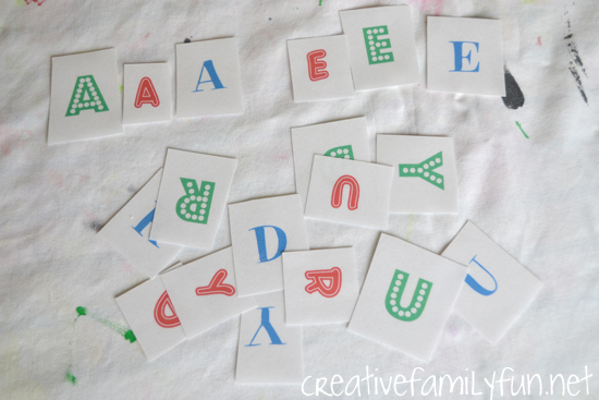 2. Letter Tiles: I typed up several versions of my daughter’s name and cut each letter individually. She can sort them or try to spell her name with them. If you don’t want to make your own letter tiles, use Scrabble tiles or magnetic letters and isolate just the letters needed to spell their name. For a super-simple version of letter tiles, write each letter on an index card.