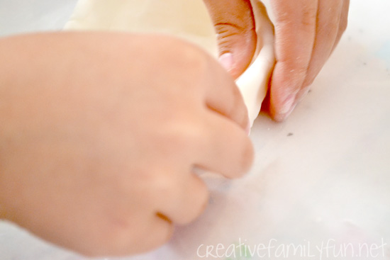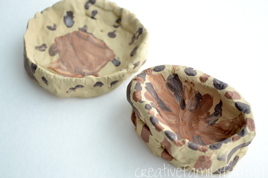 The girls found the clay very easy to work with. They made simple pinch pots to create their basket shapes. They tried several versions before they settled on their preferred shape. Plus, they just really enjoyed the feel of the soft dough and wanted to play with it for awhile. After they were satisfied, I put the pots on a foil-lined baking sheet and dried them in the oven. Do check on it frequently. Our pots dried quicker than I had anticipated. (We typically use salt dough which can take a very long time to dry. I loved that this dried so much quicker.)