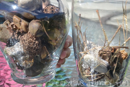 I rounded up a few jars and vases I had that were sitting around and gathering dust. We then gathered up our jars and nature treasures and got to work.