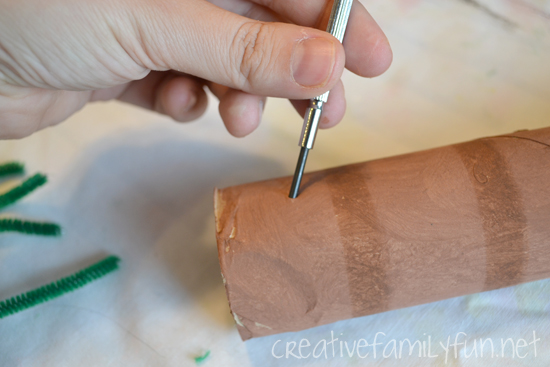 Once the paint is dry, punch one hole for each leaf in your cardboard tube. I used a tiny screwdriver to punch my holes. I also put all the holes in the top third of the tube to mimic a tree.