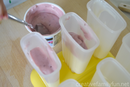 2. Fill your molds 1/3 full of your pudding mix. Add about 2 Tablespoons yogurt to the mold, then top off with your pudding mix again.